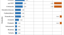 The recovery values ranged from 35.3 to 97.6%. According to the Association of Official Analytical Chemists48, the recommended range of recovery percentages for analytes at a concentration of 1 ppb varies from 40 to 120%48. Seven pesticides (trifluralin, HCH alpha, HCH beta, endosulfan I, dieldrin, bifenthrin, and lambda-cyhalothrin) showed recovery values outside the recommended range (Table 3). However, as the NIST library was used as a confirmatory method, only endosulfan I and lambda-cyhalothrin did not show acceptable recovery. Therefore, the extraction method we developed yielded satisfactory results.