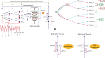 In the previous scheme, we assigned independent chaotic temporal waveforms to the slot machines for decision making. However, a negative correlation of chaotic temporal waveforms may enhance the decision-making performance9,36. Therefore, we now generate correlated chaotic temporal waveforms and assign them to the slot machines. For simplicity, we consider the case of two slot machines (N = 2), to which two temporal waveforms with negative or positive correlations are assigned. We generate two identical chaotic temporal waveforms from the same initial conditions, one of which is time-shifted, to obtain two correlated temporal waveforms. The positive and negative correlation values are 0.300 and − 0.583, respectively. We also generate two chaotic temporal waveforms from different initial conditions to obtain independent (non-correlated) temporal waveforms for comparison.