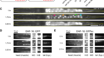 Animals at the developmental stage after the last molting and before bearing eggs (“young adult stage”) were picked up and cultured at non-permissive temperature for the daf-2 and daf-16 mutant strains, 24 °C, for one day and transferred to the microfluidic device that was soaked in M9 buffer in a 15-cm-diameter glass dish at room temperature. Then, the 15-cm-diameter glass dish containing the microfluidic device was installed in a temperature-controlled aluminum box maintained at 25 °C5. Temperature acclimation at the start of recording and later maintenance for 3 days were confirmed by direct temperature monitoring5. Animals were observed under blue-light-cut illumination by a macroscope with an apochromat objective lens (1 ×) (Z16 APO, Leica, Germany) and recorded in an H264 compressed movie5. Animal swimming activity was measured by counting pixels in a bitmap image, in which animal movement was determined by comparing the image at the previous time frame (Supplemental Video 1)5. The movie compression effect on swimming activity was corrected on the activity time series by using the moving average5.