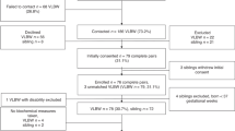 All statistical analyses were conducted using IBM SPSS (version 27). Categorical variables were compared using Fisher’s exact tests or Chi-squared tests. Logarithmic conversion was used for outcome variables not following a normal distribution. Continuous variables were analyzed with paired t-tests when comparing pairs and unpaired t-tests when comparing groups. A difference of p < 0.05 was considered statistically significant. We used linear mixed models to assess the effect of VLBW-status on our outcomes with subjects nested within families with maximum likelihood-method. We used the following variables as fixed effects: model 1 adjusts for age and sex, model 2 further adjusts for maternal smoking, gestational hypertension, maternal BMI, and primiparity, and model 3 further adjusts for subject’s own BMI. Data on maternal smoking were available for 95% (n = 142) of all subjects, and the variables were dummy coded for two variables (1 = smoking; 0 = nonsmoking or unknown, and conversely 1 = nonsmoking; 0 = smoking or unknown) for linear mixed model analyses. Maternal BMI was available for 97% of all subjects (n = 146), and unknown data were imputed using linear regression of maternal BMI difference and maternal age difference between pregnancies. Gestational hypertension classes were defined as described previously32.