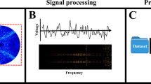 The sound data of the ith hammering sound were defined as \(A_{i} \in {\mathbb{R}}^{4096}\) (4096 sampling points). The sound data after Fast Fourier transform (FFT) analysis (Fig. 3B) was defined as \(P_{i} \in {\mathbb{R}}^{4096}\). The power spectral Pi(ω) (ω ∈ [0; 22000], sampling points) of all or partial frequency bands under the Nyquist frequency λS/2 = 22.05 (kHz) were used as input variables.