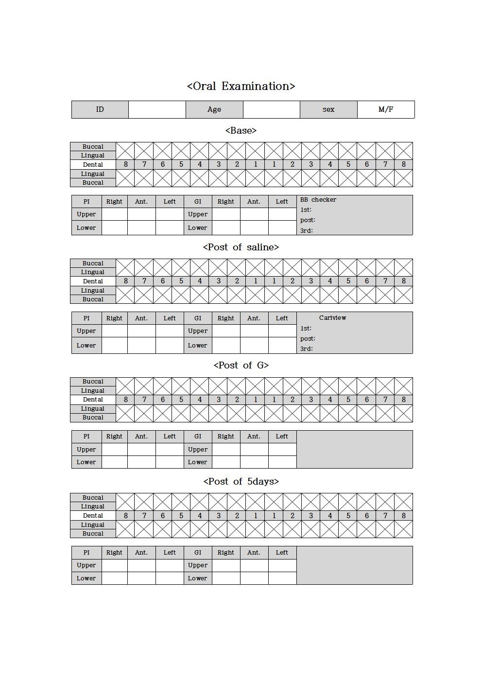 Participants who agreed to this study visited the M dental clinic in Busan one week before the start and received an oral examination by a dentist. Two dental hygienists trained under the guidance of a dentist performed light scaling on the participants for the same oral environment and provided the same toothbrush and toothpaste to them. After a recovery period of 1 week after scaling, the study started. As representative teeth for an oral examination, maxillary right first molar (#16), maxillary left central incisor (#21), maxillary left first premolar (#24), mandibular left first molar (# 36), mandibular right central incisor (#41), and mandibular right first premolar (#44) were selected and measured.