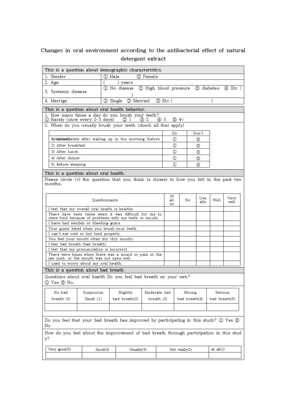 An experiment was randomized, double-blind, and placebo-controlled. In this study, a dental hygienist with more than ten years of experience directly stated the aim of the study to the patients who visited M dental clinic in Busan from October 2020 to June 2021. These patients agreed to participate in the study on December 15, 2020. Among the subjects, the following subjects who met the exclusion criteria were excluded from this study: a person with severe dental disease (e.g., periodontitis, dry mouth, dental caries), a person with a disease that may cause bad breath (e.g., Sjogren's syndrome, rheumatism, renal disease, and hepatic disease), a smoking person, a person diagnosed with sinusitis or rhinitis, a person taking antibiotics, a person with tongue problems (e.g., tongue cancer, glossitis), a person received scaling within 2 months. Among dental caries, patients with enamel caries were eligible to participate in the study, but patients with more than one dentin caries were excluded. Accordingly, the subjects of this study were those who agreed to complete the questionnaire, were not included in the exclusion criteria, and had 16 or more remaining teeth. 74 patients who satisfied the inclusion criteria were selected as the study subjects. Finally, the participants in this study were analyzed with a result of 64 subjects.