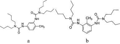 4 | TDI/DBA-4 | a. N'N''-(2-methyl-1,3- phenylene)bis(N,N-dibutylurea) b. N'N''-(2-methyl-1,5-phenylene)bis(N,N-dibutylurea) |