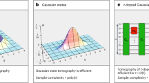 In both the expressions (1) and (2) we use the lower right indices to emphasize which modes the operators and channels act on. Starting from the inner-most component, the initial TMSV state is denoted with \({ \left| \gamma \right\rangle _{1,2} = \sum _{i = 0}^{\infty } \mu _{i} (\gamma ) \left| i\right\rangle _{1} \left| i\right\rangle _{2} }\) with coefficients \({\mu _{i} (\gamma ) = \cosh ^{-1} \gamma \tanh ^{i} \gamma }\), where the parameter \({\gamma \in \mathbb {R}}\) sets the experimentally controllable squeezing strength. We model the overall losses and inefficiencies in the preparation scheme as attenuation of the measured mode prior to its displacement. This can represented by a Gaussian quantum channel \({\mathscr {G}}_{2}^{\eta } (\hat{\rho })\) with its action on the mode given in terms of Kraus operators65 as \({ {\mathscr {G}}_{2}^{\eta } (\hat{\rho }) = \sum _{i = 0}^{\infty } {\hat{M}}_{2}(i) \hat{\rho }{\hat{M}}_{2}^{\dagger } (i) }\) with \({ {\hat{M}}_{2} (i) = \frac{1}{\sqrt{i!}} (\sqrt{1 - \eta })^{i} \sqrt{\eta }^{{\hat{N}}_{2}} {\hat{A}}_{2}^{i} }\), where \({{\hat{N}}_{2} :={\hat{A}}_{2}^{\dagger } {\hat{A}}_{2}}\) defines the photon number operator and \({\hat{A}}_{2}\) denotes the annihilation operator respective to the measured mode. The parameter \({\eta \in [0, 1]}\) describes the efficiency of the preparation circuit. Subsequently the converse \({1 - \eta }\) characterizes the overall losses and inefficiencies in the preparation scheme. The displacement of the second mode is given by the unitary operator \({ {\hat{D}}_{2} (\xi ) = \exp ( \xi {\hat{A}}_{2}^{\dagger } - {\xi }^{*} {\hat{A}}_{2}) }\), where \({\xi \in \mathbb {C}}\) is the displacement amplitude66. In a more realistic analysis of the preparation circuit it would be straightforward to include the propagation losses affecting the mode carrying the resulting state. This form of decoherence can be accounted for by modifying the squeezing strength of the non-linearly squeezed state67. Consequently we do not consider this additional attenuation since it does not influence the fundamental properties of these non-Gaussian states.