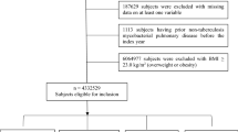 The baseline characteristics of participants were presented as mean (standard deviation) or numbers (%) according to BMI categories. TB incidence rates were calculated by dividing the number of events by 100,000 person-years (PY). Then, the TB incidence rate was fitted by a linear model for BMI on a logarithmic scale to examine the association for the range of BMI 15–30. Cox proportional hazards regression analyses were conducted to obtain the hazard ratios (HRs) and 95% confidence intervals (CIs) of TB based on whole BMI categories and especially in the underweight subpopulation. The risk of TB was analyzed after adjustments for possible factors. Model 1 was adjusted for age and sex, and model 2 was additionally adjusted for lifestyle (smoking status, alcohol consumption and physical activity) and low-income state. Model 3 was further adjusted for history of hypertension, diabetes and dyslipidemia. Stratified analysis was performed by dividing the participants into subgroups according to age (< 40, 40–65, or ≥ 65 years), sex, smoking status, alcohol consumption, physical activity, income and presence of hypertension, diabetes, and dyslipidemia. Statistical analyses were conducted using SAS (version 9.4; SAS Institute, Cary, NC, US) and STATA software (MP, version 16.1; StataCorp, College Station, TX, US), and statistical significance was defined as two-sided p < 0.05.