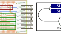 The modulated signal reaches then a 500-\(\upmu\)m-long multi quantum-well SOA used to adjust the output power. Figure 3d reports the SOA emission as a function of the polarization current. One may note no amplified spontaneous emission (ASE) when biasing the SOA with 2 mA and a transparency condition is obtained around 10 mA. For polarization currents higher than 40 mA the device operates properly, occupying a large part of the optics communications C band, more specifically, 62 nm of 3-dB bandwidth centered at 1535 nm. In addition, a gain saturation can be observed as a function of the current increment. The SOA output reaches a SSC that optimizes the OFC coupling into the output optical fiber. A high numerical aperture fiber array has been placed at the chip edge by using a 3D micro-positioner. Therefore, the fiber array must be positioned as close as possible to the SCC for optimizing the optical power coupled into the array, ensuring that it does not touch the chip edge, since it can damage the PIC. The output optical power was around − 2 dBm, measured by a wide-area detector, whereas the coupled power was around − 7 dBm, resulting in a coupling/alignment loss of around 5 dB. The photonic integrated circuit power consumption is lower than 0.5 W, considering the SOA and DBR-LD consumption. Regarding the RF generator used (PSG E8267D from Keysight), the typical power consumption is around 450 W. It is worth mentioning that no thermoelectric cooler (TEC) was required in this case, the device was fixed on a metal surface used as a heat-sink. The heat from the SOA and the DBR-LD does not significantly impact the phase modulators Vpi, and consequently, the comb generator response. Therefore, no instabilities due to the thermal crosstalk effects have been experienced during the experiments. In addition, the temperature of the laboratory environment was controlled and always kept around 19 °C.