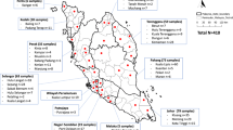 The present study was a cross-sectional survey of malaria prevalence including speciation in people from Kapuas Hulu District in West Kalimantan Province. This district has a total area of 29,842 km2 and a population of 253,740 in the latest census by Indonesian Bureau of Statistics49. It was selected as the study site based on its close proximity to the Kapit division in Sarawak, Malaysia30 with which it shares its northern border (see Fig. 1). Kapuas Hulu has stable low malaria transmission with an Annual Parasite Incidence (API; number of positive cases per 1000 individuals in a year) of 0.1312. It has tropical climate with an average temperature of 26.7 °C and average annual precipitation of 4231 mm. The district comprises mainly forested and plantation areas. The population lives in towns, in villages by rivers or lakes, and in housing inside plantations.