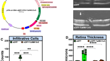 Mice were intravitreally injected with the different AAVs under isoflurane anesthesia and after local anesthetic eye drops were applied (Novesin, OmniVision). Both eyes of 6 mice per group were injected with either 1 × 108 viral genomes (VG)/eye (low dose) or 1 × 109 VG/eye (high dose) in 1 µL AAV buffer. Note that AAV-VEGF was injected at a concentration of 1 × 108 VG/eye and AAV-TNF-α and AAV-IL-6 at 1 × 109 VG/eye with matching AAV-stuffer controls. In an independent mouse cohort, 2 weeks after AAV-TNF-α treatment, eyes were IVT injected with 1 µL of vehicle or neutralizing anti-TNF-α Golimumab (100 mg/mL, Simponi, 4,223,913, Komtur Apotheke). If IVT injection failed (e.g. due to damage of a major blood vessel or the lens), the eye was excluded from analysis.