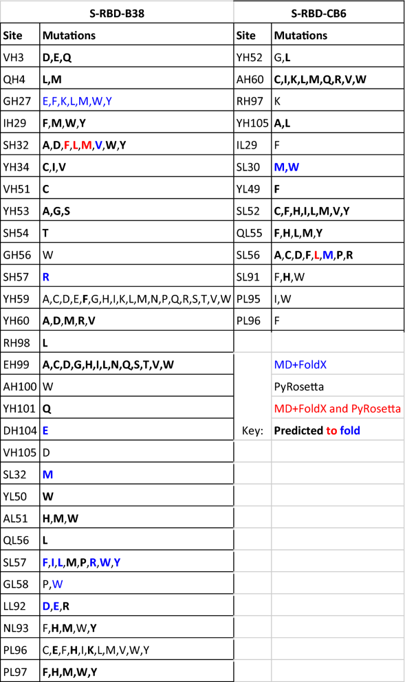 1. The left table contains those predicted for B38, and right is for CB6. The left column in each subtable is the site and the right column shows the list of mutations predicted to strengthen the binding interaction between the S-RBD and the antibody. Predicted strengthening mutations are colored based on whether both methods predict strengthening (red), only MD + FoldX predicts strengthening (blue), or only PyRosetta predicts strengthening (black). Bold font denotes mutations that are predicted to allow folding.