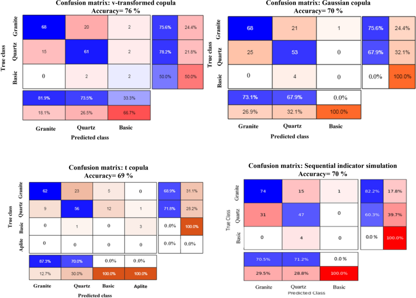 Table 4 Percentage of classification accuracy of v-transformed copula, Gaussian copula, t copula, and sequential indicator simulations for four lithotypes.