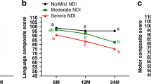 The Mullen Scales of Early Learning (MSEL80) were used as a direct assessment of developmental skills at both the 14- and 36-month-old visits. The Early Learning Composite (ELC) score reflects the overall level of cognitive skills. Second, the Vineland Adaptive Behaviour Scale—Second Edition (VABS-II81,82) is a parental questionnaire/interview measuring adaptive behaviours. The standard scores (mean 100, and standard deviation 15) were derived for the Communication domain, and the Socialization domain here. Third, the SRS-283 is a parental questionnaire assessing the severity of traits of autism with separate scores available for Social Communication and Interaction (SCI) and Restricted Interests and Repetitive Behaviour (RRB). Lower standardized T-scores reflect fewer autism-related difficulties.