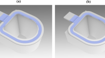 Squat toilets involve a wide variety of designs, and the gravity-flow (“cistern”) system and pressure-valve (“flushometer”) system are the two most common types. In a cistern system, water flows under gravity, and thus water pressure is nearly irrelevant to the flushing process. Therefore, a cistern system was chosen in this study, as shown in Fig. 1. During flushing, the water jets exit through 35 ports, each with a diameter of 8 mm. There is also a main rectangular flushing port of 5 cm × 1.5 cm located on the right side of the toilet bowl. The bowl of the squat toilet is shallow with a 9 cm depth in the middle.