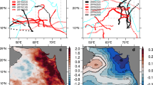 Figure 4 shows the Gulf’s annual mean net evaporation and wind speed. The net evaporation shows interannual fluctuations of ±10% around its mean value. The wind shows a weak, but significant, downward trend (\(p<0.05\)); the net evaporation trend is not statistically significant. The two quantities are significantly correlated (\(r=0.41,\,p<0.01\)) confirming that changes in wind speed strongly affect evaporation in the Gulf46,47. (Omitting precipitation, the correlation of wind and evaporation alone increases to \(r=0.57,\,p=0.0001\); evaporation alone also does not show a significant trend).
