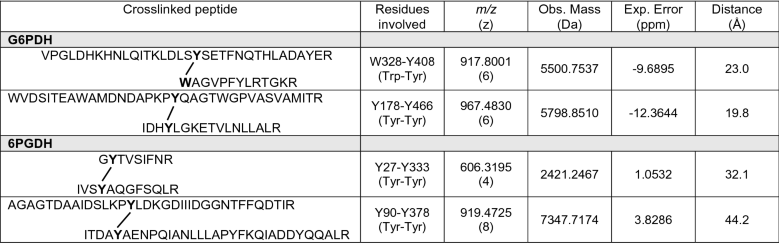 1. Observed mass-to-charge ratio (m/z) values, with errors in parts per million, are indicated. The sequence of the crosslinked peptides (with the amino acids involved in the crosslinks highlighted in bold) are indicated. The observed mass of the crosslinks is also included. The distance from aromatic ring to aromatic ring in the crosslinked peptides was estimated from the 3D structure of G6PD (alphafold structure: P0AC53) and 6PGD (PDB: 3FWN). The crosslinks listed were found in all the replicates subjected to oxidation, and not in any of the controls.