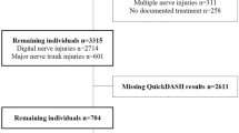 The sick leave pattern and time to RTW after surgery for UNE has not been studied as thoroughly as RTW after carpal tunnel release (CTR), traumatic ulnar nerve injuries or severe hand trauma6,7,8. The definition of return to work may vary among studies, comprising both return to part time work or return to work with modified work duties. Several predictive factors for prolonged RTW after CTR have been identified, including manual labour, depression, and bilateral surgery6,9,10. Other factors such as being self-employed, not being able to return to modified duties and not receiving workers’ compensation on the contrary have the opposite effect and may promote earlier RTW6. Worse preoperative status among patients with carpal tunnel syndrome (CTS), evaluated by the short version of Disabilities of the Arm, Shoulder and Hand, QuickDASH, predicts lower rate of RTW10. In addition, a history of long-term sick leave can affect the postoperative outcome measured by the QuickDASH for patients having surgery for UNE11.