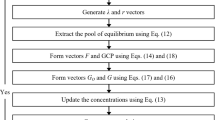 At the end of the main loop of the EVO, there are only two newly generated position vectors for each of the particles as \({\mathrm{X}}_{\mathrm{i}}^{\mathrm{New}1}\) and \({\mathrm{X}}_{\mathrm{i}}^{\mathrm{New}2}\) if the enrichment level of the particle is higher than the enrichment bound, while for the particle with a lower enrichment level, only \({\mathrm{X}}_{\mathrm{i}}^{\mathrm{New}}\) is generated as a new position vector. At each state, the newly generated vectors are merged with the current population, and the best particles participate in the following search loop of the algorithm. A boundary violation flag is determined for the decision variables which go beyond the predefined upper and lower bounds, while a maximum number of objective function evaluations or a maximum number of iterations can be utilized as a termination criterion. The pseudo-code of the EVO is presented in Fig. 3, while the flowchart of this algorithm is provided in Fig. 4.