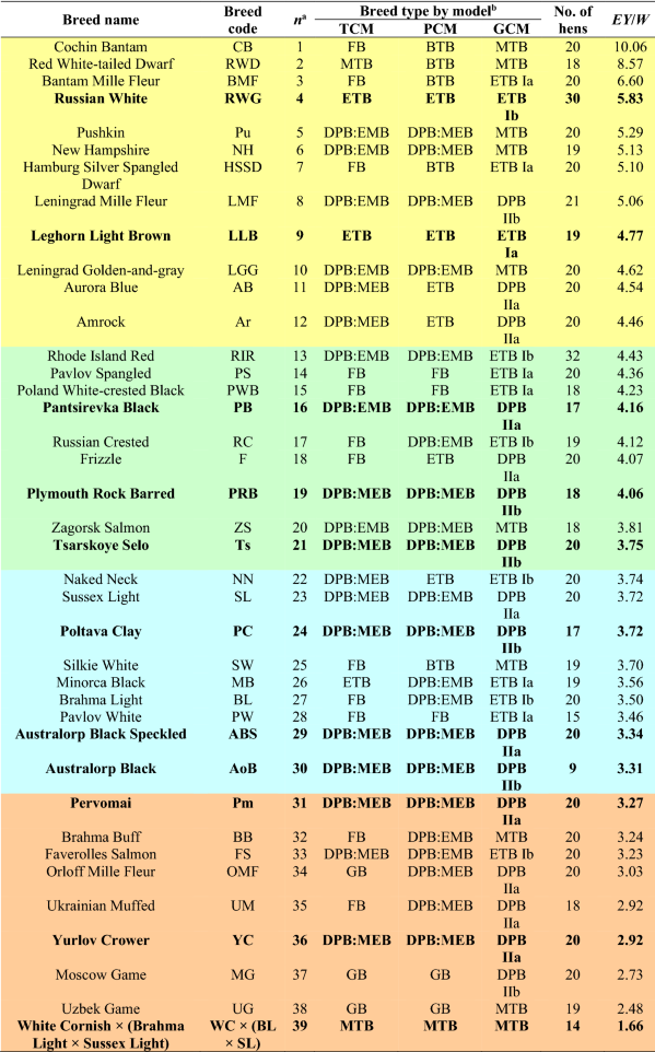 Table 1 Chicken breeds used in this study respective to breed classification (clustering) models7 and ranked by EY/W values.
