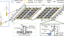 The coefficient of inertia, \(I_{FOWT} (\omega )\) for FOWT, \(A_{Hydro} (\omega )\) represents the platform’s added mass, \(M_{Platform}\) and \(M_{Tower}\) are the platform and tower mass matrices, respectively. In the damping matrix \(D_{FOWT}(\omega )\) for FOWT, \(D_{Hydro}(\omega )\), \(D_{Tower}\), and \(D_{viscous}\) denote the floating platform damping, flexible tower matrix, and viscous drag, respectively. \(D_{chamber}\) indicates the external damping caused by PTO’s effect on overall dynamics. The stiffness matrices \(S_{FOWT}\), \(S_{Hydro}\), \(S_{Mooring}\) and \(S_{Tower}\) are defined as, the platform’s hydrostatic restoring matrix, mooring lines, spring stiffness and the tower stiffness coefficients matrix, respectively.