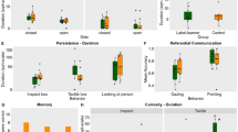 The Object Bias Index and Side Bias Index (derived, numeric) were calculated for each occasion, independent of task (looking versus fetching), but across trials defined by the same cue-control level (panel versus no panel). The difference between the occurrence of the majority response and the less frequent response was divided by the total number of responses (for Object Bias: preferred object—non-preferred object/total; for Side-Bias preferred side—non-preferred side/total).