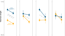 Heritability estimates of TL vary greatly across species and populations30,42,43,44. However, if TL is only measured in adults, it is not clear whether the estimated heritability reflects additive genetic effects (VA) of TL itself versus VA of individual susceptibility to telomere shortening during their lifetime prior to TL measurement, or both. Indeed, little is known about the heritability of telomere shortening rates. Hjelmborg et al.45 estimated a heritability of telomere shortening of h2 = 0.28 in adult human twins (n = 652), which was smaller than their estimated heritability for adult TL (h2 = 0.64) and TL heritabilities reported in other human studies (e.g.46). In contrast, Bauch et al.47 found a low heritability of telomere shortening rates (h2 = 0.09) during the first month of life in western jackdaws (Coloeus monedula, n = 474), but a high heritability of early-life TL (h2 = 0.74).