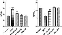 The BHA and BA-exposed rats had a considerably increased ALP level. In contrast, the PS, SB, and CP groups showed a significant reduction in ALP levels compared to the control groups. The increase in ALP concentration may be attributed to the cytotoxic effect of BHA and BA, which led to damage to liver cells26. On the other hand, the inhibitory effect of PS, SB, and CP on ALP enzyme activity might be related to their interaction with Zn as ALP is a Zn2+-metalloprotein. Monanu et al.55 correlated the SB inhibitory action on ALP enzyme to its aggressive processing in the liver at chronic levels that may burden the liver, resulting in liver malfunction.