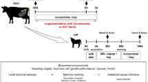 On the day before sampling (2, 29, and 59 d of age), an automated calf feeder was not available for the calves. Blood samples were collected at 3, 30, and 60 d of age immediately before the morning feeding at 9 a.m.; this was achieved using Vacutainers to collect serum (Venoject® II, Terumo Co., Ltd., Tokyo, Japan). All the samples were centrifuged at 1200 × g for 30 min at 20 °C, and serum was stored at −80 °C until analysis. Single-use gloves disinfected with 70% ethanol and sampling tubes with spoons were used to collect rectal feces from the calves immediately after blood sampling at 3, 30, and 60 d of age. The fecal samples were stored at − 30 °C and thereafter stored at − 60 °C to − 80 °C until analysis.