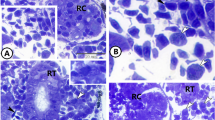 The pseudobranch of Molly fish was embedded in the connective tissues situated in the opercular cavity near the first gill arch and was supplied with an afferent artery. It exhibited the appearance of gill-like lamellae that were oriented in 6–7 lobules surrounded by a thin connective tissue (Fig. 1A). Its lamellae showed no contact with the external environment. The lamellae comprised several rows of parallel lamellae, which were fused to each other by a thin connective tissue throughout their length. The lamellae consisted of a central blood capillary, which was surrounded by large glandular pseudobranch cells (PSCs) (Fig. 1B,C).