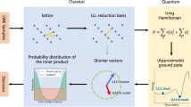 To obtain the correct answer for an LWE problem using Algorithm 2, the solution of Eq. (22) must be successfully calculated in each loop. In our algorithm, instead of solving Eq. (22), an MIS problem obtained from Eq. (22) is solved. However, it is not guaranteed that the solution of Eq. (22) can be calculated from a solution of the MIS problem. This is because the solution of Eq. (22) may not satisfy Eq. (32) for all \(j\in \Omega _{i\delta }\). The smaller the number of Eq. (32) that holds for the solution of Eq. (22), the more difficult it is for a quantum annealing machine to find the solution. To reduce the burden on the quantum annealing machine that solves the MIS problem, a lattice-reduction algorithm such as the Lenstra–Lenstra–Lavász (LLL) algorithm or BKZ algorithm16,21,22 is assumed to be used at Step 1 of Algorithm 2. Since vectors found by a lattice-reduction algorithm are set as sample points, we can expect the error (the third term) of Eq. (22) to be small. Unfortunately, a lattice-reduction algorithm takes a very long time to run. The LLL algorithm is a polynomial-time algorithm, but its performance is inadequate. The BKZ algorithm can find a shorter vector in general, but it needs a longer amount of time.