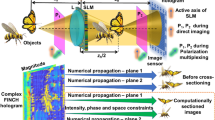 For the first configuration (Fig. 2a), a point object with an amplitude of \(\sqrt{{I}_{o}}\) is considered. The complex amplitude of the point object at a distance of z1 from the plane of a refractive lens having a focal length f1 is given as \({C}_{1}\sqrt{{I}_{o}}Q\left(1/{z}_{1}\right)\), where \(Q\left(a\right)=\mathrm{exp}\left(i\pi {ar}^{2}/\lambda \right)\), \(r=\sqrt{{x}^{2}+{y}^{2}}\) and C1 is a complex constant. For the polarization multiplexing method, the modulation function can be expressed as \(\mathrm{exp}\left(i\pi {r}^{2}/\lambda {f}_{2}\right)\) \(\mathrm{for}\) one orientation and constant for the other orthogonal orientation. The phase function displayed on the SLM for the random multiplexing method is given by \(\Phi (x,y)=B(x,y)+\left(\pi {r}^{2}/\lambda {f}_{2}\right)\left(1-B(x,y)\right)\), where \(B(x,y)\in \left\{\mathrm{0,1}\right\}\) is a binary random function. The first term of \(\Phi (x,y)\) does not change the incoming light, while the second term focuses light at z2/2 when f2 satisfies the relation (f1 + f2)/(f1f2) = 1/z1 + 2/z2, and in the case z1 = f1, f2 = z2/2. The complex amplitude after the SLM is given as \({C}_{2}\sqrt{{I}_{o}}Q\left(1/{z}_{1}-1/{f}_{1}\right)\mathrm{exp}\left[-i\Phi (x,y)\right]\), where C2 is a complex constant. The point spread function is given as \(I_{{{\text{PSF}}}} = \left| {C_{2} \sqrt {I_{o} } Q\left( {1/z_{1} - 1/f_{1} } \right){\text{exp}}\left[ { - i\Phi \left( {x,y} \right)} \right] \otimes Q\left( {1/z_{2} } \right)} \right|^{2}\), where ‘\(\otimes\)’ is a 2D convolutional operator. As FINCH is a linear shift-invariant system, the hologram H for an object O can be given as \(I_{{{\text{PSF}}}} \otimes O\). Since FINCH uses an in-line configuration, at least three holograms H1, H2 and H3 with phase shifts θ = 0, 2π/3 and 4π/3 are recorded and combined as \(H_{C} = H_{1} \left( {{\text{exp}}\left[ { - i4\pi /3} \right] - {\text{exp}}\left[ { - i2\pi /3} \right]} \right) + H_{2} \left( {1 - {\text{exp}}\left[ { - i4\pi /3} \right]} \right) + H_{3} \left( {{\text{exp}}\left[ { - i2\pi /3} \right] - 1} \right)\) to obtain a complex hologram. The image of the object is reconstructed from the hologram as \(I_{R} = H_{C} \otimes Q\left( {1/z_{R} } \right),\) where zR is the reconstruction distance. By tuning the reconstruction distance, it is possible to reconstruct different planes of the object. For the second configuration (Fig. 2b), with the polarization multiplexing method, the modulation function can be expressed as \(\mathrm{exp}\left(i\pi {r}^{2}/\lambda {f}_{2}\right) \mathrm{for}\) one orientation and \(\mathrm{exp}\left(i\pi {r}^{2}/\lambda {f}_{3}\right)\) for the other orthogonal orientation. For the random multiplexing method and assuming z1 = f1, the phase function displayed on the SLM is given as \(\Phi (x,y)=\left(\pi {r}^{2}/\lambda {f}_{2}\right)B(x,y)+\left(\pi {r}^{2}/\lambda {f}_{3}\right)\left(1-B(x,y)\right)\), where \({f}_{2}^{-1}+{f}_{3}^{-1}=2{z}_{2}^{-1}\) to satisfy the beam matching condition23. The first image is formed at a distance z3 (= f2 in case z1 = f1) from the SLM. The above two configurations are used to compare the performances of the random multiplexing method with the proposed new method using TAP-GSA. For the first configuration, three cases, namely, polarization multiplexing, random multiplexing and the new approach using TAP-GSA, were compared. For the second configuration, random multiplexing and the new method are compared.