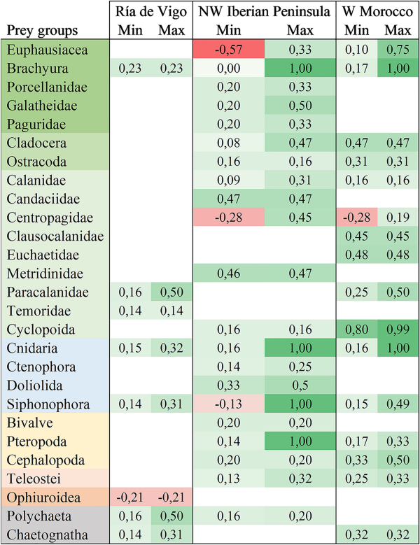 Table 3 Maximum and minimum linear index of food selection values obtained for the different prey groups detected in Octopus vulgaris paralarvae along the ICC.