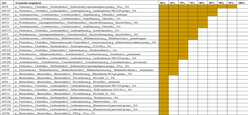 Table 1 Core ASVs identified in at least 60% of ruminal fluid, nasopharyngeal, vaginal and uterine microbiota samples (N = 323) from finishing beef heifers.