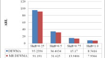 The zero state ARL performance of DEWMA3 is compared by using different run rule schemes with the existing profiling methods that are found in the paper of Abdella et al.46. He made a comparative study by using Hoteling T2, DEWMA3, and EWMA/R initially proposed by Kang and Albin14 and Kim et al.15. Abdella et al.51 proposed a set of methods for the monitoring of profile model in Phase-II after assuming in-control process parameter values. The in-control situation described as: \({Y}_{i}=3+2{X}_{i+}{\in }_{ij}\) where X is fixed i.e., X = {2, 4, 6, 8} and \({\epsilon }_{ij}\sim N\left(0,{\sigma }^{2}=1\right)\). In this article, we have used the transformed profile model as: \({Y}_{ij}=13+2{X}_{i}^{*}+{\epsilon }_{ij}\). The control limit coefficients are adjusted for individual ARL0 of around 600 for process parameters of DEWMA charts which provided the overall ARL0 of roughly 200. As we have three process parameters to be studied. For each process parameter we get an individual ARL0 and then the overall ARL0 is found by the expression: \(\frac{1}{overall {ARL}_{0}}=\frac{1}{Individual\,{ARL}_{01}}+\frac{1}{Individual\,{ARL}_{02}}+\frac{1}{Individual\,{ARL}_{03}}.\) Abdella et al.51, Kang and Albin14 and Kim et al.15 considered three different types of step shifts i.e., in the intercept, slope and error variance of the regression line that are also used in this study for comparison purpose after using R-Software based on 10,000 simulations.