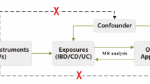 In this study, we identified single-nucleotide polymorphisms (SNPs) that were strongly associated with UC, CD, and PBC, with genome-wide significance of P \(<\) 5 × 10–8. To ensure the independence of the SNPs, we eliminated those with linkage disequilibrium (LD) greater than r2 < 0.001 within a clumping distance of 10,000 kb. We then assessed the strength of the instrumental variables (IVs) using an F statistic > 10 to minimize the impact of weak IVs on the causal analysis. The F statistic was calculated using the following equation: F = (R2/1 − R2)(n − k − 1/k), where n is the sample size and R2 is the variance as interpreted by the IVs. R2 was calculated using the minor allele frequency (MAF) and β-value: R2 = 2MAF (1 − MAF) β2. All variables used in the analysis had F values greater than 10. By harmonizing, we also eliminated ambiguous and palindromic SNPs. To avoid potential pleiotropy, we used the PhenoScanner V2 (http://www.phenoscanner.medschl.cam.ac.uk/) to exclude IVs associated with confounding or risk factors for PBC, such as exposure to environmental pollutants and radiation15. In total, 43, 59, and 16 SNPs were used as IVs for UC, CD, and PBC for subsequent MR analysis. Details of these IVs are provided in Supplementary Tables 1–3, and all the confounders and excluded SNPs are in Supplementary Table 7.