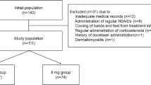 Management of DIFR is prevention using corticosteroids8 and symptom control with diuretics4. Piccart et al. reported that patients who received 40 mg methylprednisolone for three days, from day − 1 to 1, and 7 to 9, for docetaxel on day 1 and 8, had a delayed onset of DIFR compared to non-administered patients (median time to onset: 84 vs. 62 days) and obtained a higher median cumulative dose of docetaxel before symptom onset (333 vs. 215 mg/m2)8. However, dexamethasone (DEX) 8–16 mg/day for 3–5 days was administered for DIFR prophylaxis in other clinical studies2,4,9, suggesting that the appropriate dosage of corticosteroids for DIFR prevention remains unclear. At the Hokkaido University Hospital, prophylactic corticosteroids were administered as oral DEX 4 mg once a day on days 2–4. This dosage was changed to 8 mg orally on days 2–4, according to previous reports2,4,9. Therefore, this study aimed to determine the dose-dependent preventive effects of DEX on DIFR.