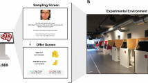 There are two key challenges in past empirical studies that complicate inference from prior results, both of which we aim to overcome in the present study. The first is that proposer behavior in real interaction studies is different in UG and IG, so differences in responder behavior are uncontrolled. For example, the experimental setup in Bolton and Zwick13 does not guarantee constant unfair offers across games, allowing unfair offers to become expected in the IG, and responders to adapt to it by not rejecting the offer. Conversely, in the UG, offers are more often fair, which may set an expectation for more fair offers, leading to more rejection of unfair offers. One workaround that guarantees equal prevalence of unfair offers is using preprogrammed offers, but this deception may undermine the credibility of proposer behavior. E.g. the experimental set-ups of the three studies in Yamagishi et al.4 use the strategy method (study 1), only providing unfair offers to responders (study 2) and providing predefined numbers of unfair offers (study 3). Although participants in some cases might be convinced that they directly play with a proposer, such deviations from natural human-to-human interaction may affect responders’ behavior if they rightly doubt the actual proposer payoff consequences of their own decisions. The second limitation of past work is the limited measurement of emotions and thought processes. Those studies that do make use of direct biophysical measures, such as electroencephalography (EEG) or functional magnetic resonance imaging (fMRI)4,7,16,17,18,19, use preprogrammed offers for balancing unfair offers, because many trials with unfair offers are needed for good EEG and fMRI measurement, especially when rejection is uncommon.