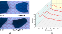 Plasmonic activity of manufactured nanostructures was measured by UV–vis spectroscopy method. As can be seen in Fig. 8 position of resonance for silver and copper based nanostructures is different, as well as, the intensity of resonance is various. It corresponds to results obtained by others5,57,58,59,60. Especially the multipolar resonance mode can be observed for silver nanostructures, due to its relatively large size40. Extinction coefficient of copper nanostructures is lower than for silver, what result in lower intensity of recorded resonance for Cu based nanomaterials5. The spectrum recorded for bimetallic nanostructures is an ideal composition of two spectra for Ag and Cu. Presence of two resonance minims, characteristic for silver and copper, indicates a nanocomposite, not a naoalloyed structure of islands13,60.