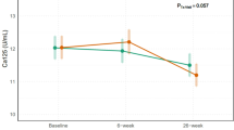 LogCA125 significantly decreased in patients on treatment with dapagliflozin [1-month: Δ − 0.18, (CI 95% = − 0.33 to − 0.22; p = 0.025), and 3-month: Δ − 0.23, (CI 95% = − 0.38 to − 0.07; p-value = 0.005), omnibus p-value = 0.012] as is shown in Fig. 1a. When CA125 percent changes from baseline were evaluated, we found a significant decrease of 18.4% and 31.4% at 1 and 3-month, respectively (omnibus p-value = 0.026), as is shown in Fig. 1b.