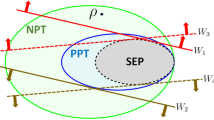 For non-decomposable EWs, the situation is much more complicated29. Recall that a bipartite state is called a PPT state (Positive Partial Transpose) if \(\rho ^\Gamma \ge 0\), i.e. both \(\rho \) and \(\rho ^\Gamma \) are legitimate quantum states. Now, W is a non-decomposable EW if and only if it detects a PPT-entangled state. Let \({\mathcal {D}}^{\textrm{PPT}}_W\) be a set of PPT states detected by W. Now, \(W_1\) is non-decomposable–finer than \(W_2\) if \({\mathcal {D}}^{\textrm{PPT}}_{W_2} \subseteq {\mathcal {D}}^{\textrm{PPT}}_{W_1}\). An EW W is non-decomposable–optimal if there is no non-decomposable–finer EW than W. Actually, if an EW W is non-decomposable–optimal, then \(W-D\) for a PPT operator D is no longer an EW. It means that one cannot improve W (i.e. make it finer) by subtracting a PPT operator P. Interestingly, it has been proven12