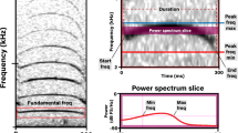 To be comparable with previous studies on measured characteristics of West Indian manatee vocalizations11,41,43,46, six parameters were characterized from the fundamental frequency (the first harmonic) of each vocalization: Minimum and Maximum Frequency (Hz) (measured from the power spectrum with a 10 dB threshold); Duration (s) (measured from the waveform); Peak Frequency (Hz) (frequency at which peak power occurs within the selection58); Bandwidth (Hz) (value of the maximum frequency minus the minimum frequency); and Center Frequency (Hz) (the frequency that divides the sound into two frequency intervals of equal energy58). Minimum and maximum frequency were calculated by generating the average power spectrum of the entire measurement box around each call with a 10 dB threshold: minimum was the point of intersection on the left of the plots and maximum was the point of intersection on the right (see Fig. 1 in Brady et al.46). Spectrograms for recordings from Florida were calculated with a time resolution of 5.33 ms and a frequency resolution of 46.8 Hz (DFT: 1024; Hanning window; 50% overlap). Belize and Panama recordings were downsampled to 48 kHz, then calculated with a time resolution of 5.33 ms and a frequency resolution of 46.8 Hz (DFT: 1024; Hanning window; 50% overlap).