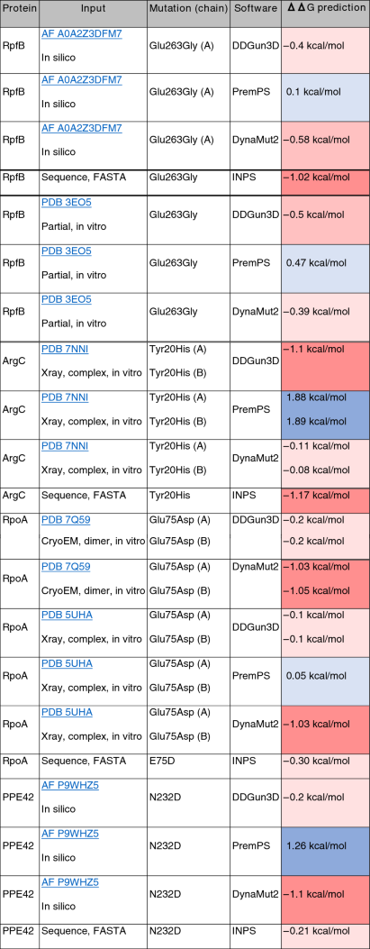 Table 2 ΔΔG predictions on protein structure of a subset of identified mutations. Software packages DDGun3D, PremPS, and DynaMut2 utilize input of .pdb structures, though PremPS only accepts X-ray crystallography and not Cryo-EM structures. Software INPS uses sequence information exclusively. ΔΔG values are shaded from blue (+ ΔΔG) to red (− ΔΔG).