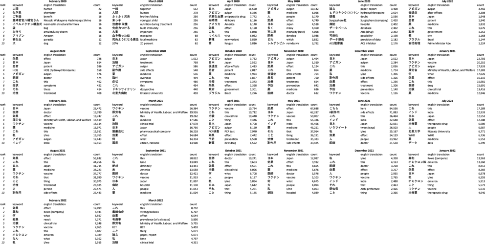 Table 5 Top 10 keywords by month in Japanese.