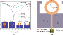 Figure 1 depicts the suggested antenna structure design. The dimension of the invention is 100 × 80 × 1.6 mm3. The finite element method is used to model the proposed antenna structure. There are two stages involved in finalizing the single-element design. The planned single-element design is presented in Fig. 1a. The optimized design of one element-based MIMO antenna is shown in Fig. 1b. The four port-based MIMO design is represented in Fig. 1c.