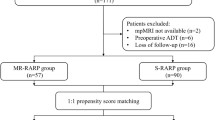 Statistical methods for clinical variables and definition of outcomes. A review of retrospectively obtained clinical data from electronic medical records was conducted. Patient information was anonymized and de-identified prior to the analysis. For each group, descriptive statistics were used to summarize the clinical presentation (age at diagnosis, biopsy GS grade, PSA level at diagnosis (PSA), and clinical T stage by MRI). Continuous variables are presented as medians (ranges) and categorical variables as numbers (percentages). The Mann–Whitney U-test was performed to determine the statistical significance of continuous variables between the NS RARP and non-NS RARP groups, while the chi-square test or Fisher’s exact test was used for categorical variables14.