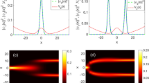 Referring to the previous study52, we assume the following values of the parameters which characterize this initial condition, namely \(\beta = 0.5\), \(\delta ^2_x = 500\) a.u., \(x_1 = -300\), \(x_2 = 300\) and \(p_1 = 0.15\) a.u. Owing to this selection of the parameters, the presented initial condition (27) is the phase-space representation of the SC state given by the superposition of two well-separated and well-localized Gaussians approaching each other with the same momenta. Let us note that the relative phase still remains to be a free parameter of the initial condition, creating the possibility of researching its influence on the WDF dynamics generated by solving the Moyal equation in inhomogeneous dispersive media. Of course, the problem formulated in this way is too general; hence we decided to conduct a study on the three-element class of the considered bimodal states, which are well recognized in the literature. The class of these states consists of the odd and even SC states for which the relative phases are \(\theta =0\) and \(\theta =\pi\), respectively, and the Yurke-Stoler state with \(\theta =\pi /2\). The influence of \(\theta\) on the value of the normalization factor given by Eq. (28) has been found to be negligibly small due to the numerical values of the prefactors \(\exp \left( -2p_1^2\delta _x^2/\hbar ^2\right)\) (approximately \(1.7 \times 10^{-10}\) [a.u.]) and \(\exp \left( -{(x_1-x_2)^2}/{(8\delta _x^2)}\right)\) (approximately \(8.2 \times 10^{-40}\) [a.u.]).