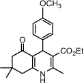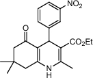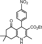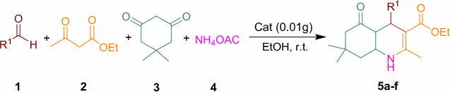 1. aReaction conditions: (1) Substituted aldehyde (1 mmol), (2) ethyl acetoacetate (1 mmol), (3) dimedone (1 mmol), (4) ammonium acetate (2 mmol), UiO-66-Pyca-Ce (III) (0.01 g), ambient temperature; bIsolated yield.