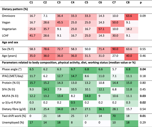 1. The characteristics of participants that compose each cluster are presented. The color intensity increases with increasing value. C: cluster; EI: daily energy intake; IPAQ: International Physical Activity Questionnaire; LCHF: low-carbohydrate high-fat; MET: metabolic equivalent of task; MUFA: monounsaturated fatty acids; PUFA: polyunsaturated fatty acids; SFA: saturated fatty acids.