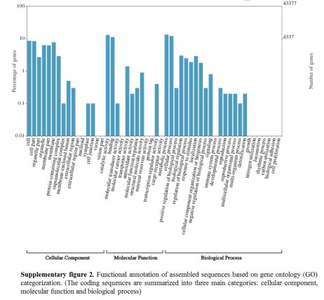 TransDecoder-v5.3.0 (http://transdecoder.github.io/) was used to predict coding sequences (CDS) from the retrieved unigenes and identified candidate coding regions within unigene sequences. The functional annotation of coding sequences was performed using the DIAMOND program20 which is a BLAST-compatible local aligner for mapping translated DNA query sequences and finds homologous sequences for transcripts against non-redundant protein database from NCBI. GO analysis of identified coding sequences was carried out using the Blast2GO program. GO mapping was executed to retrieve GO categories for functionally annotated transcripts. BlastX result accession IDs were used to retrieve gene name symbols, identified gene names or symbols are then explored in the species-specific appearances of the gene product tables of the GO database. BlastX result accession IDs are used to retrieve UniProt IDs utilizing PIR that incorporates PSD, UniProt, SwissProt, TrEMBL, RefSeq, PDB and GenPept databases.