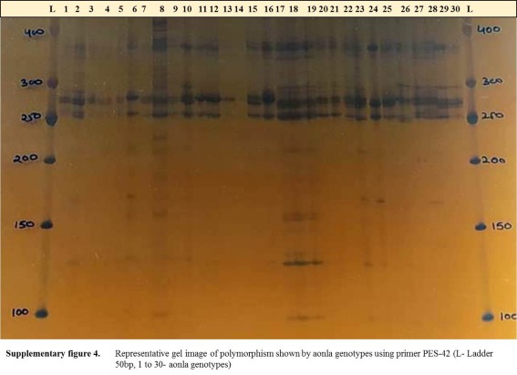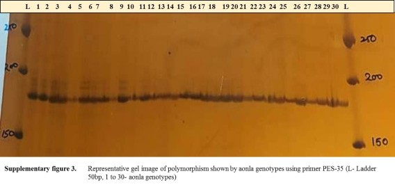 A total of 30 EST-SSR markers were designed to evaluate the genetic diversity among the studied aonla genotypes. For PCR analysis, a final volume of 10 µl reaction mixture containing 1X Taq polymerase buffer with MgCl2, 0.2 mM dNTP, 0.3U Taq DNA polymerase, 10 pmol SSR primers (Eurofins, India), and 50 ng/l of genomic DNA was utilized. The following thermal profile was used for the PCR amplification in the thermal cycler (Applied Biosystems, USA): initial denaturation at 94 °C for 5 min; 35 cycles of 94 °C for 1 min; annealing at varying temperatures depending on the primer pair for 45 s; and extension at 72 °C for 45 s; followed by final extension of products at 72 °C for 8 min. Following polyacrylamide gel analysis of the PCR results and assessment of amplicon size were measured against a 50 bp DNA ladder (GeNei, Bangalore, India).