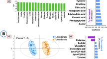 The significant biochemical from OPLS-DA analysis were selected based on the variable importance in projection (VIP) > 1, as reported earlier by Hasegawa et al.32. Table S6 in the Supplementary Information 3 provides the list of these significant biochemicals. These significant biochemicals were used for Pathway Analysis from MetaboAnalyst 5.0., using a Mus musculus library containing 82 pathways. Table 2 shows the pathways that have a corresponding p-value < 0.05. The complete list of pathways is provided in Table S7 in Supplementary Information 3. Match status in Table 2 reflects hits/total, where total means the total number of compounds in the pathway, and the hits are the actually matched compounds from the list. The p-value reflects the raw p-value; Holm p is the adjusted p-value calculated from the Holm-Bonferroni method; the FDR means the False Discovery Rate; and the impact is the pathway impact value calculated from pathway analysis.